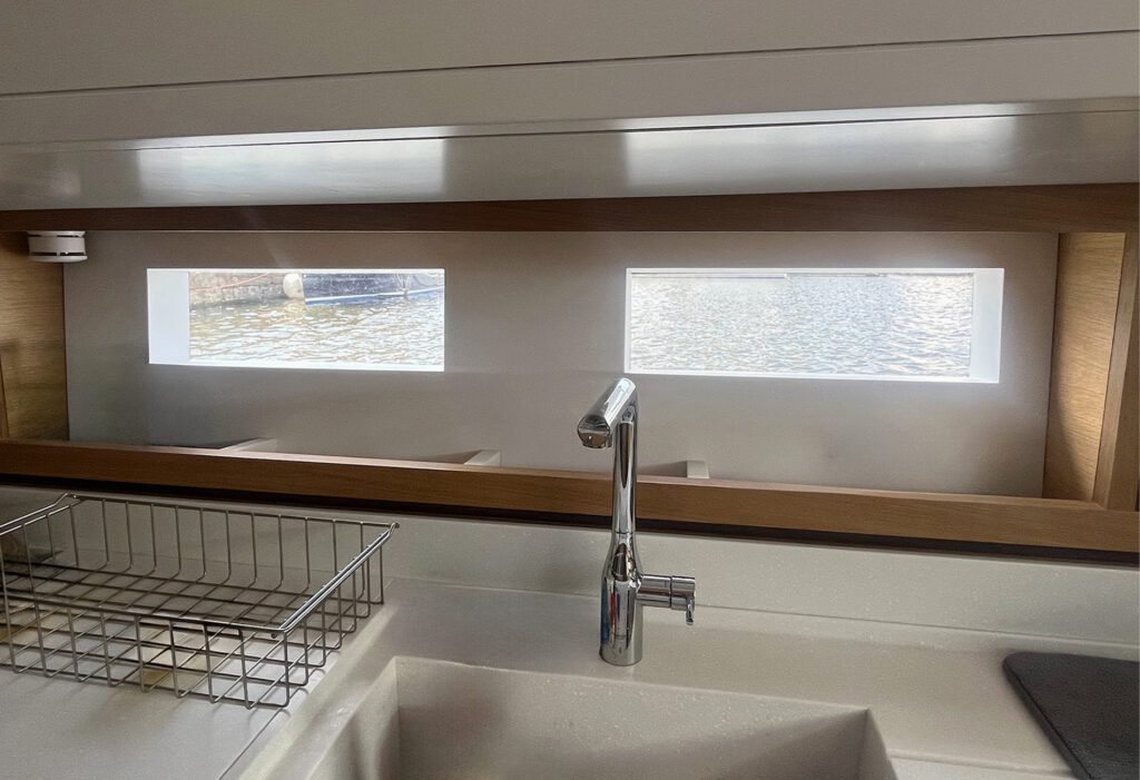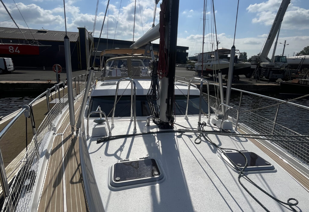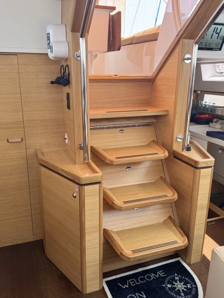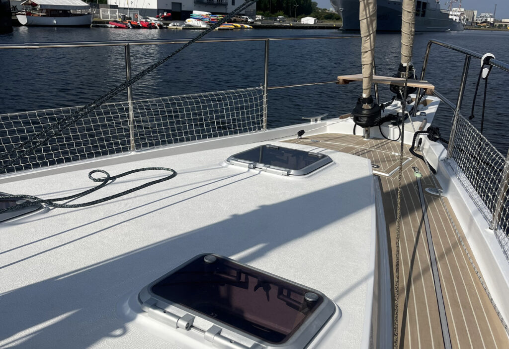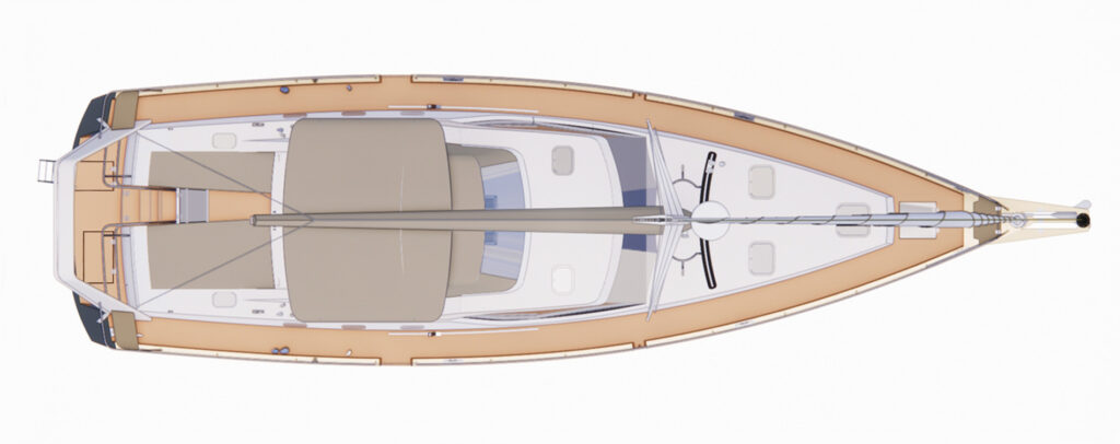 At the bow, the boat is equipped with a long bowsprit and rigged with an aluminium mast with automatic reefing, genoa and self-tacking staysail.