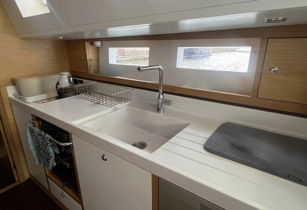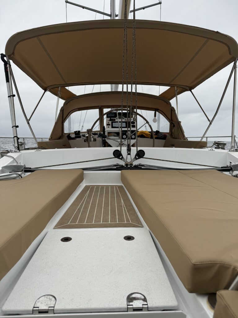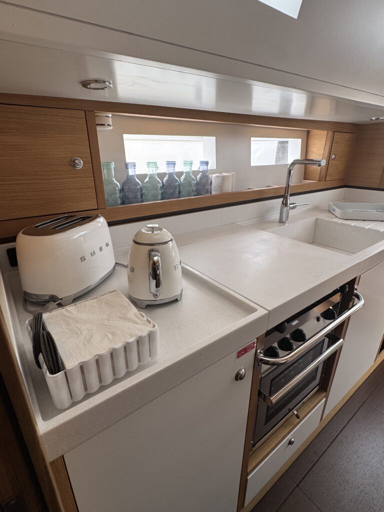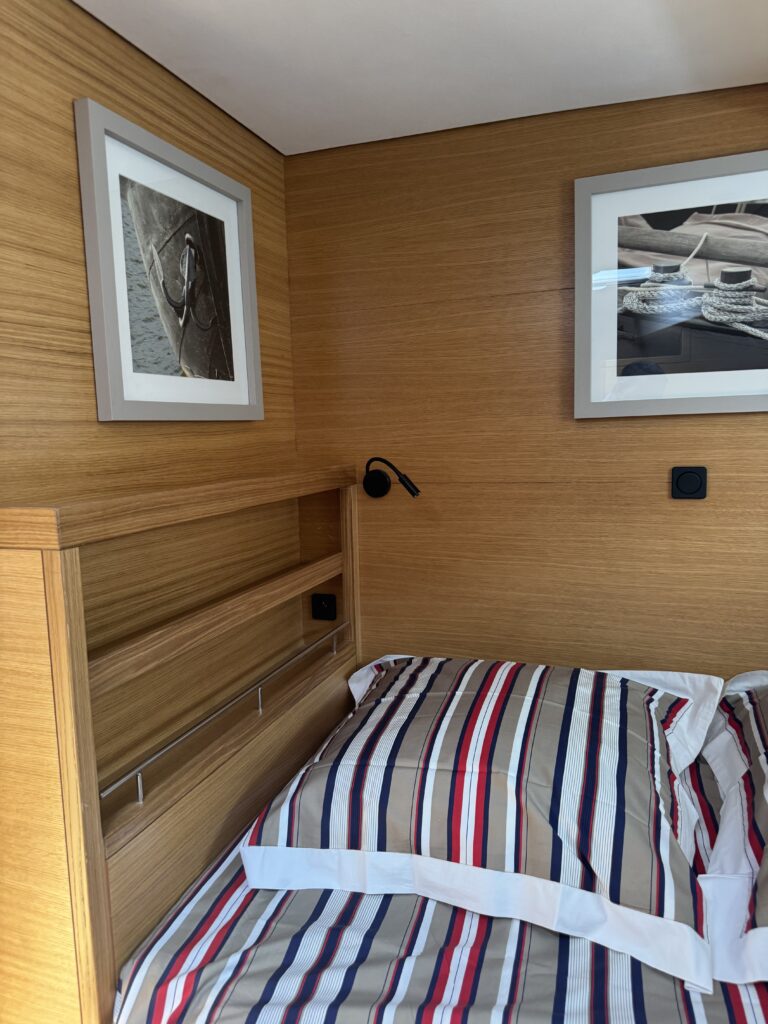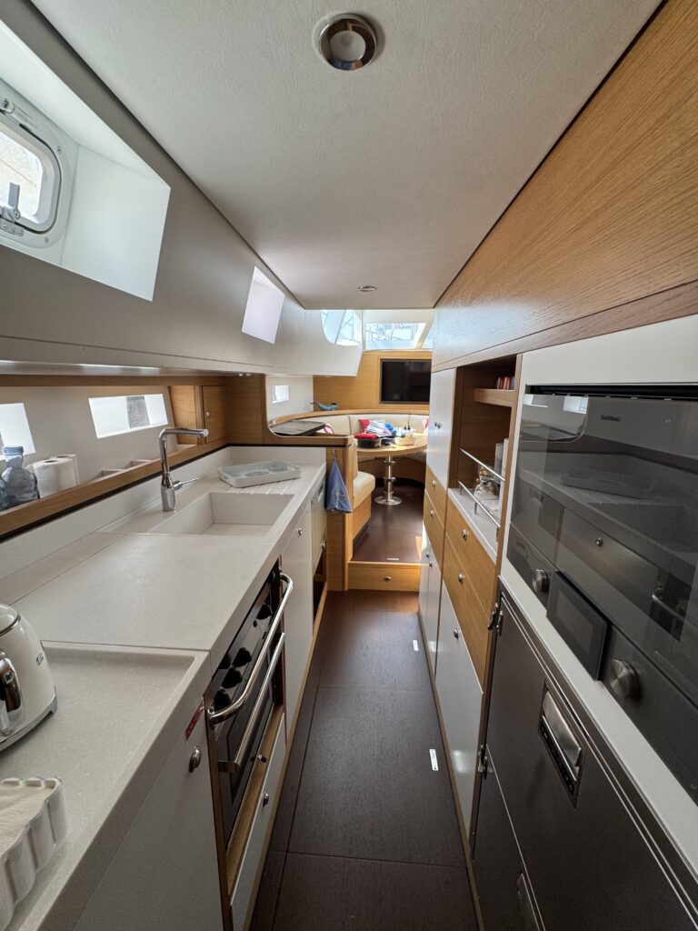 At the bow, the boat is equipped with a long bowsprit and rigged with an aluminium mast with automatic reefing, genoa and self-tacking staysail.