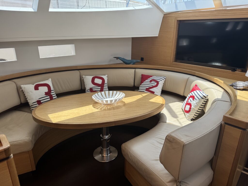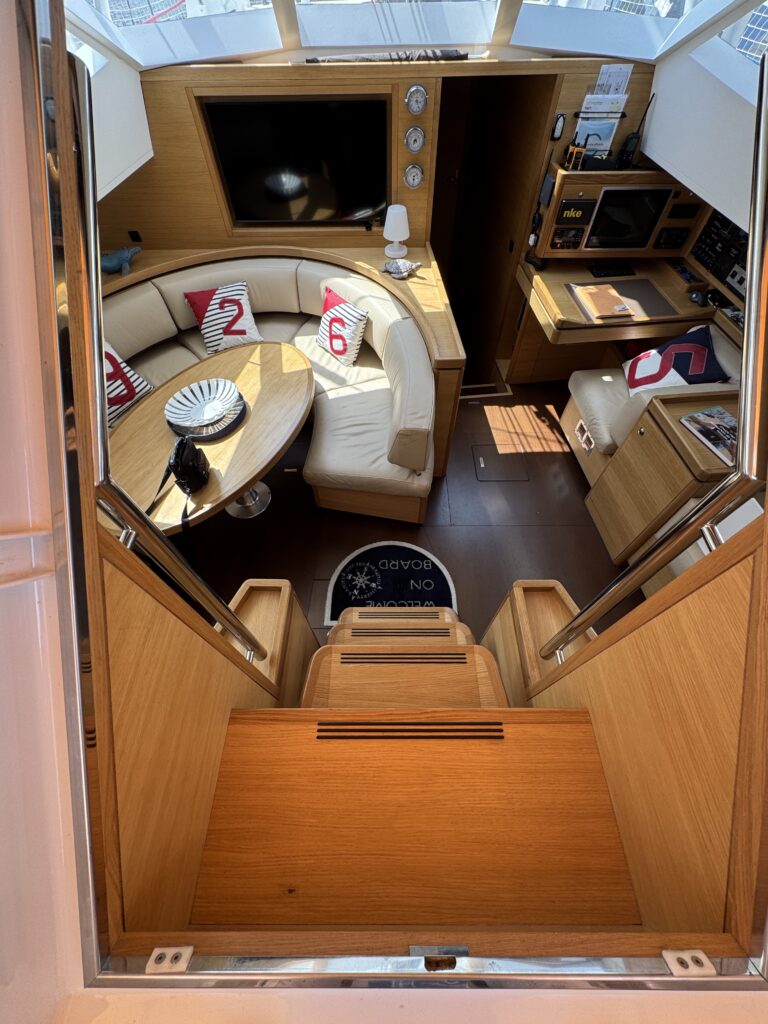She has been fitted out as a true central cockpit. The aft area has been fitted with sunbathing areas and an dedicated “path” leading to the transom with plenty of storage spaces.