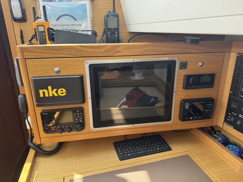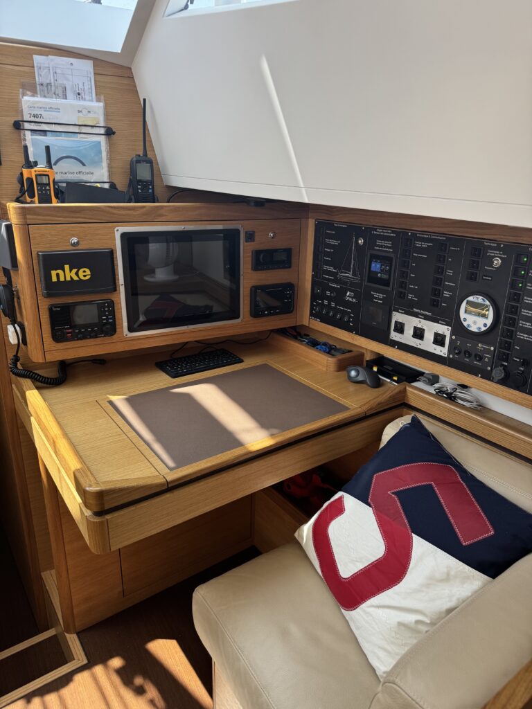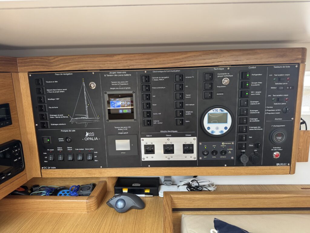 • Dashboard at the helm: Tachometer, hour meter , alarms and START/STOP controls, FURINO TZ9 chartplotter, FURINO radar and autopilot, NKE autopilot, NKE multi-display and multi-graphic with pad, chain counter, drift indicator, bow thruster control panel, electric sail control, deck light, remote VHF