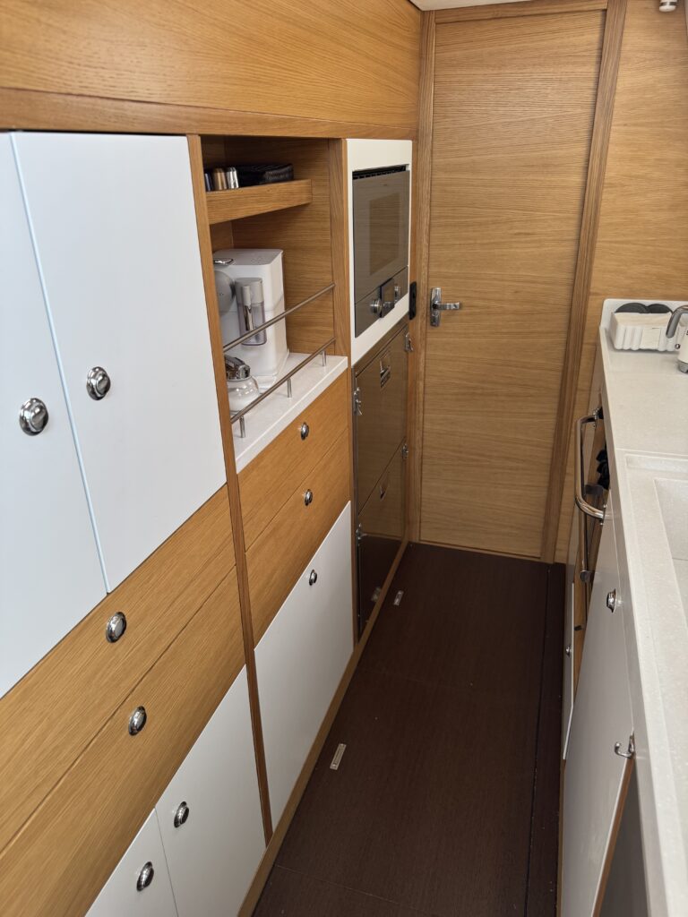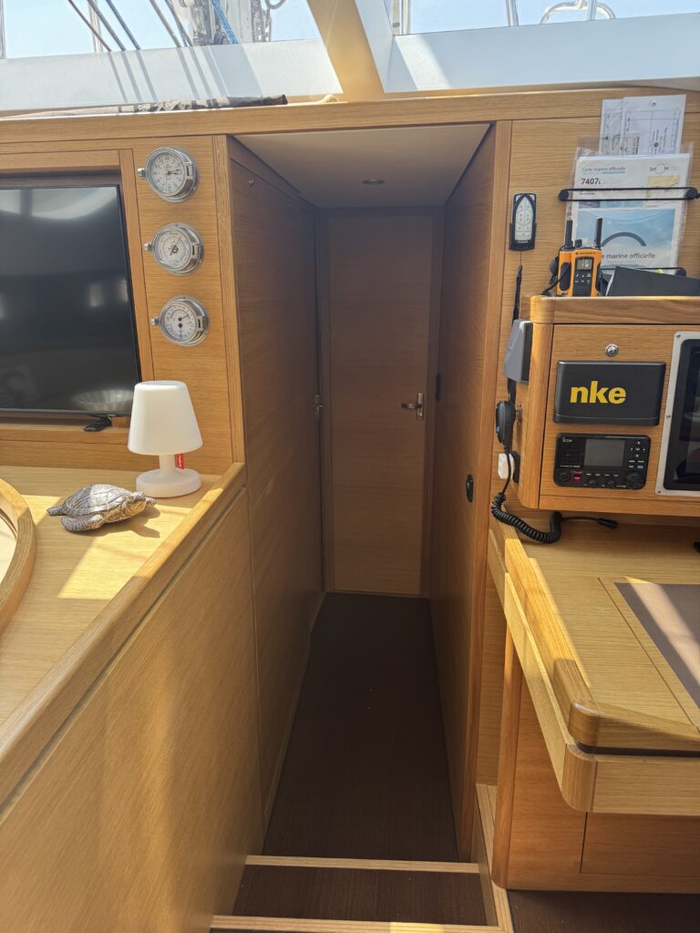 Innovation concerning the interior ergonomics of the boat are the following: Access to the engine room is through a real full height swing door. The idea is to perform the access and maintaince of the equipments: watermaker, generator, propulsion engine, air conditioning unit etc.