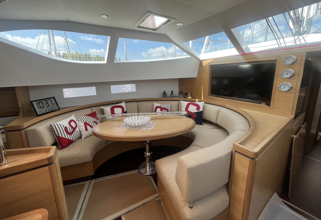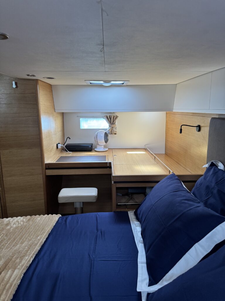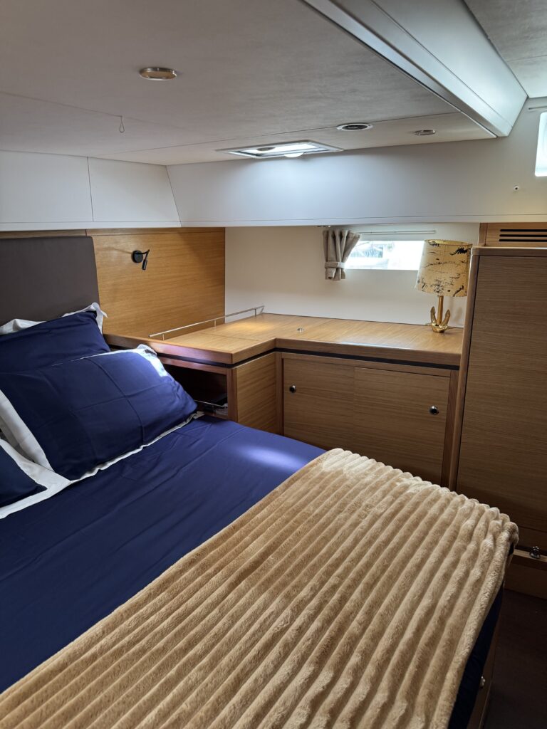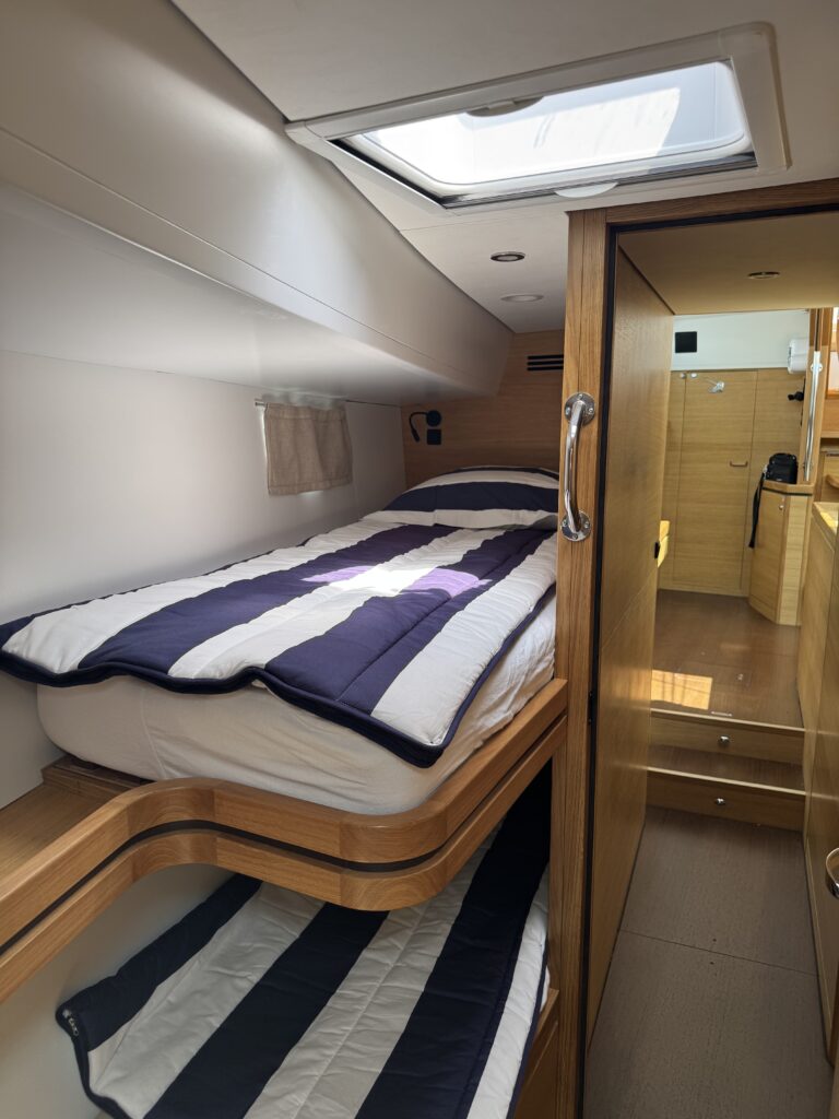 • Number of cabins: 3 ( 1 owner’s cabin aft, 1 double guest cabin forward, 1 guest cabin forward with 2 bunk beds, saloon convertible into a 2-person berth)