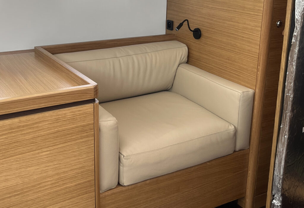 • Living room: Card table, marine-style leather benches, storage, LED lighting.